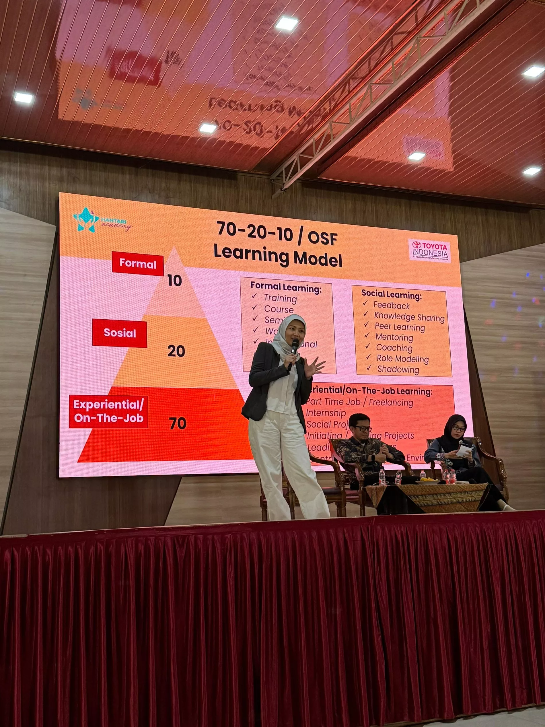Pembicara lainnya adalah Ahsanul Khaliqin, Senior Manager Human Capital Strategic Management PT Toyota Motor Manufacturing Indonesia (TMMIN). Dengan materi bertajuk "Stay Adaptive, Stay Relevant", beliau membagikan pelajaran berharga dari perjalanan kariernya yang dinamis di berbagai bidang. "Satu-satunya yang pasti dalam bisnis adalah perubahan. Kunci untuk bertahan dan berkembang adalah dengan terus beradaptasi dan menjaga relevansi diri," jelas Ahsanul. Beliau menggarisbawahi pentingnya lifelong learning dan keberanian untuk keluar dari zona nyaman, sejalan dengan bagaimana TMMIN secara aktif mengembangkan talenta-talentanya melalui berbagai program.